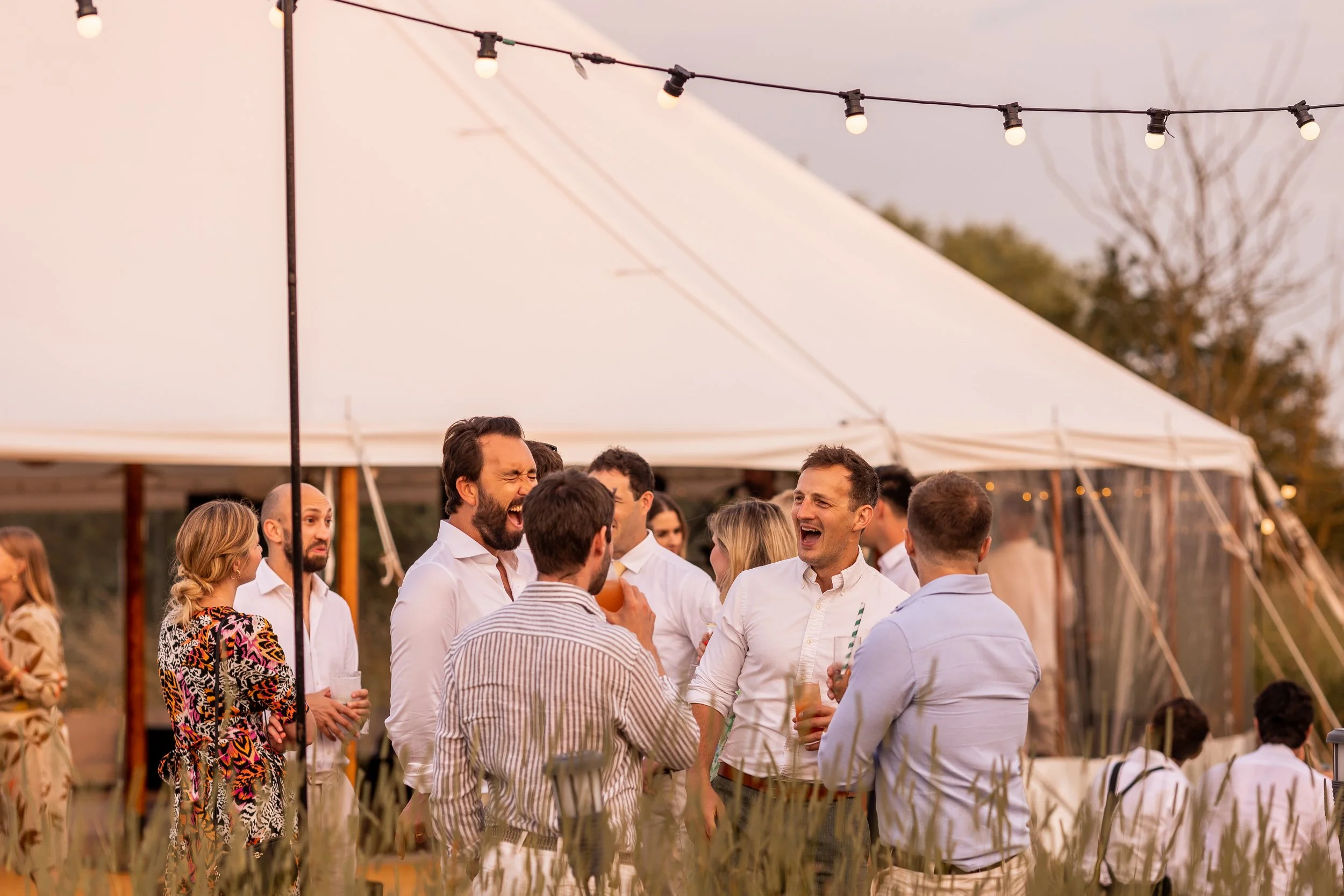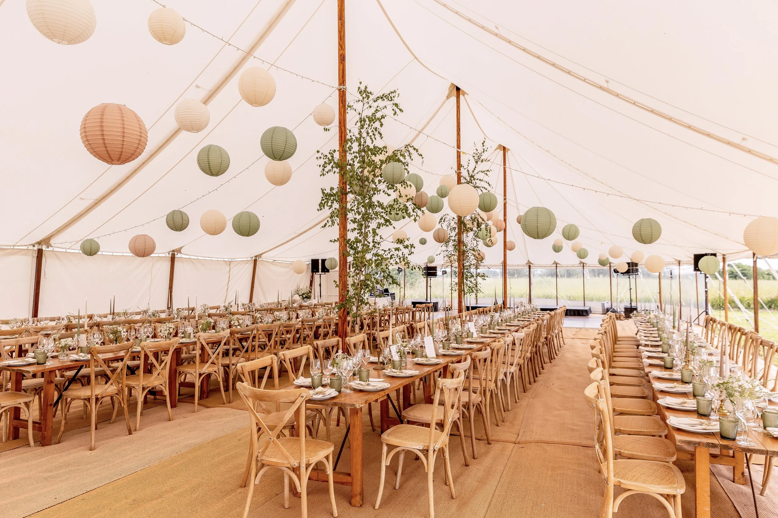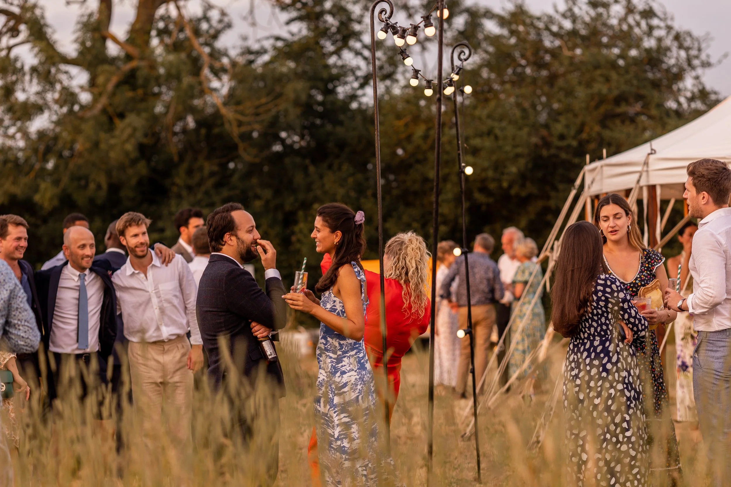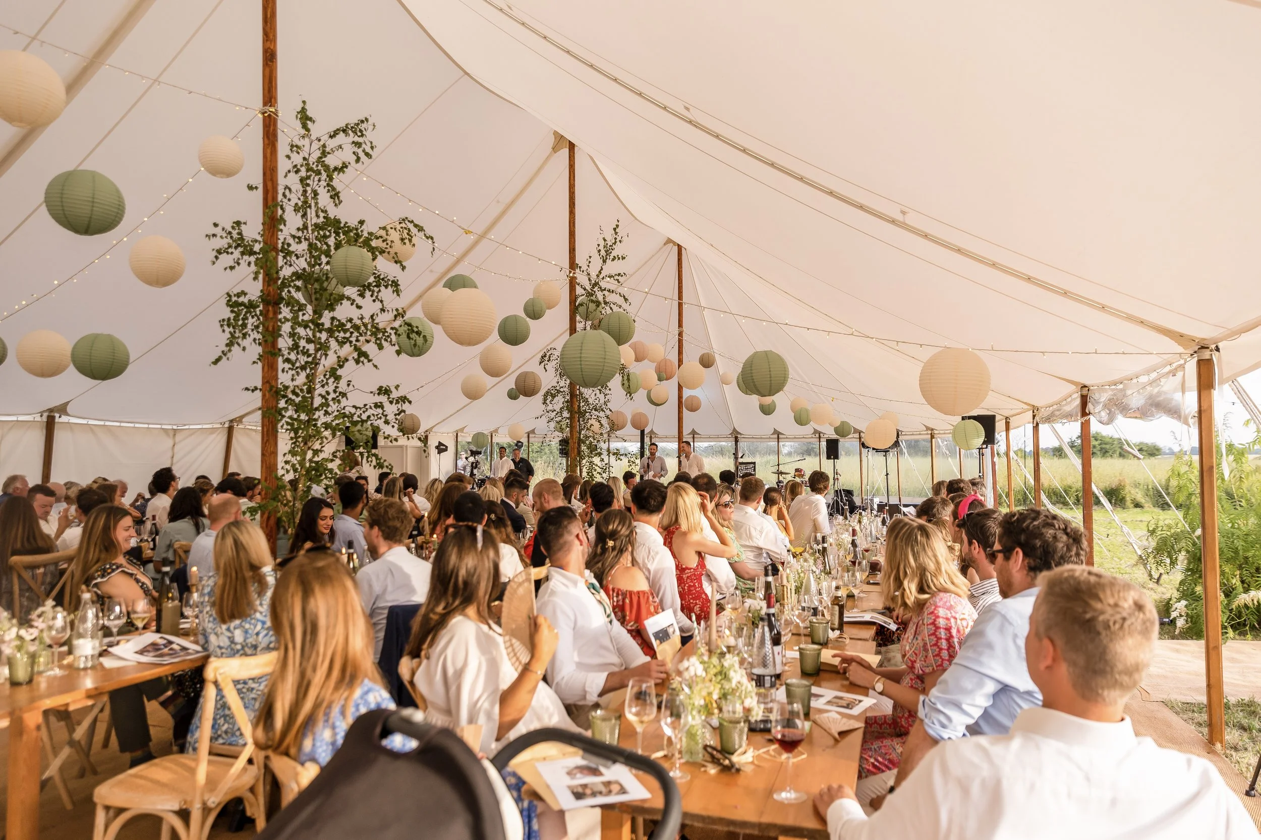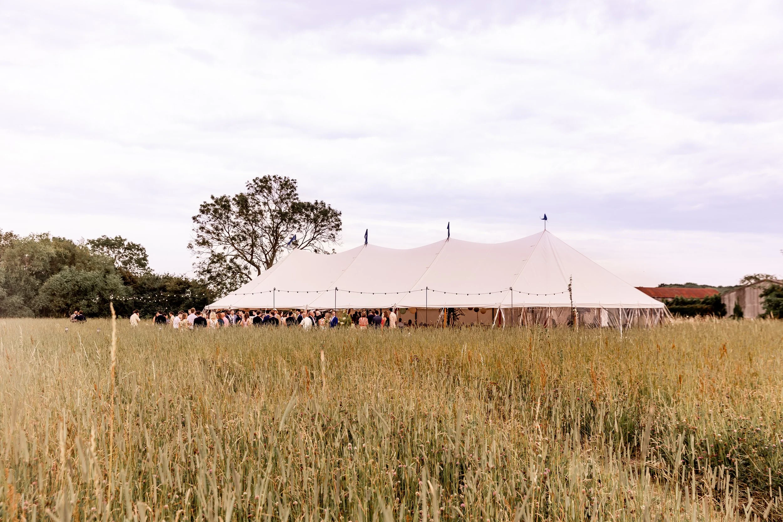 A marquee set up in the Agroforestry Field in July 2023. The field has west-facing views and wonderful evening light.