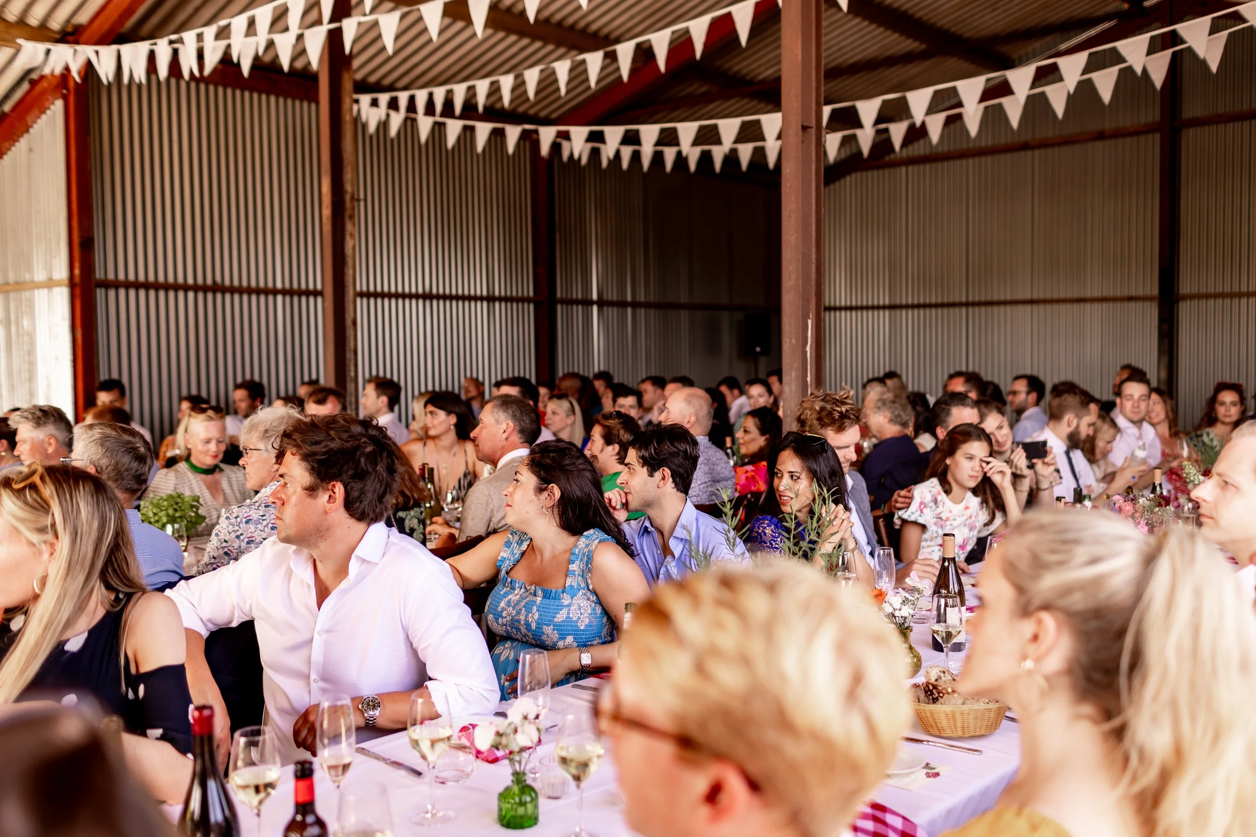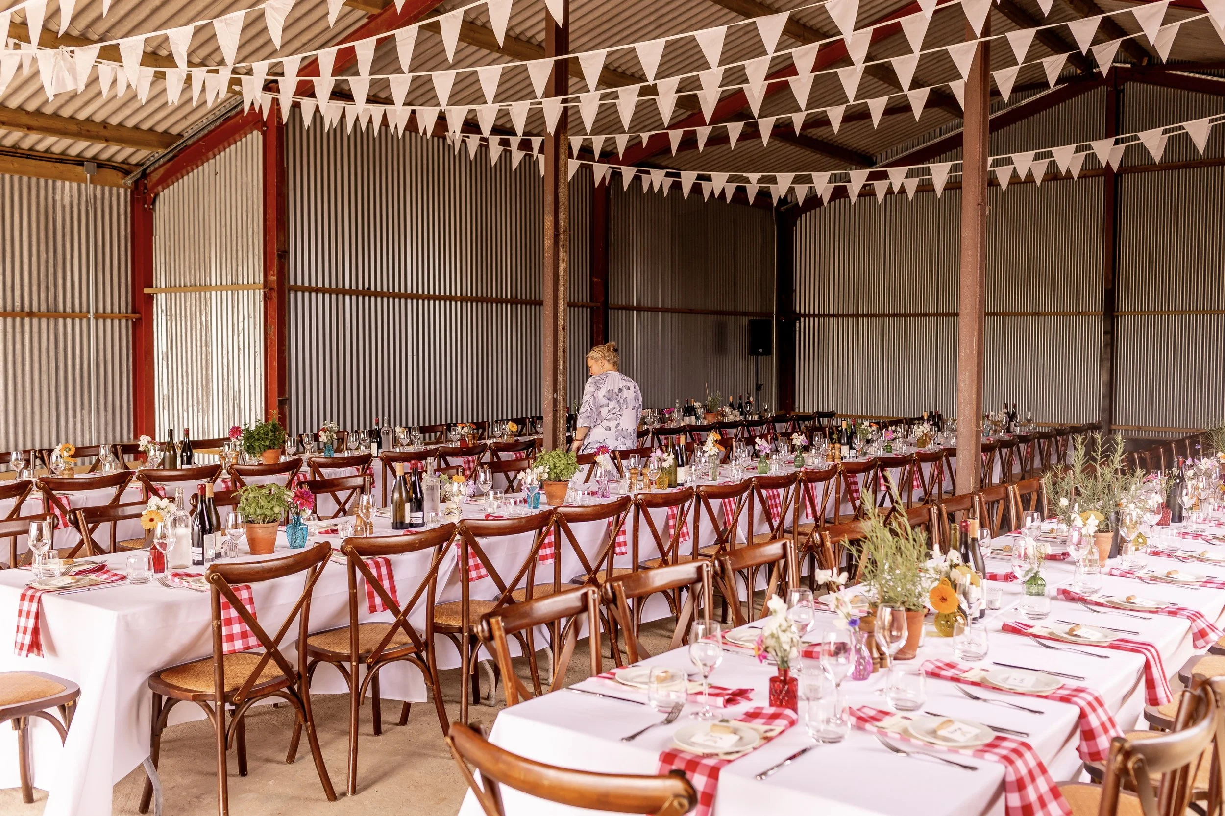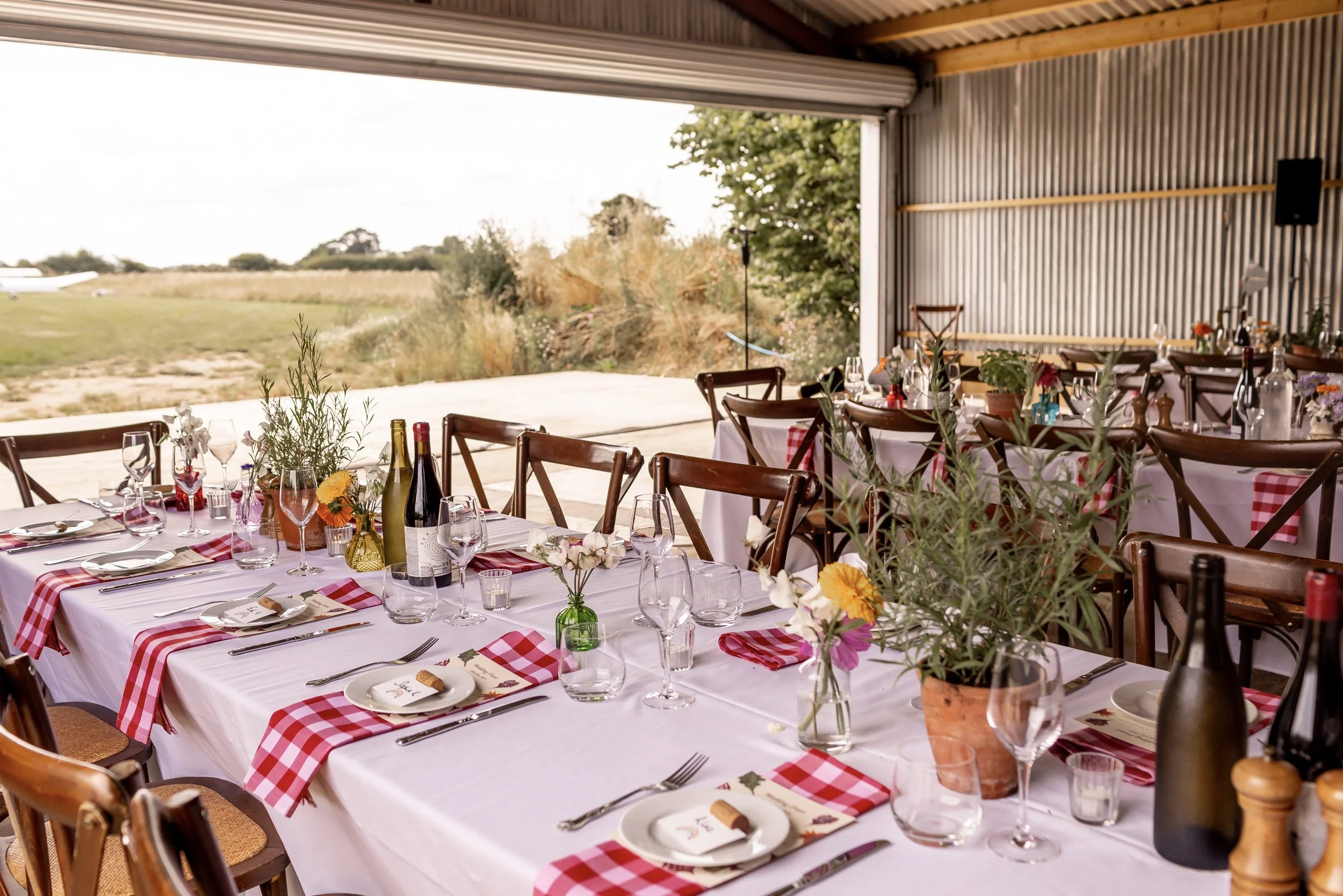 Hanger Barn can easily accomodate wedding feasts for up to 140 guests on three long tables; this photograph shows 116 guests.