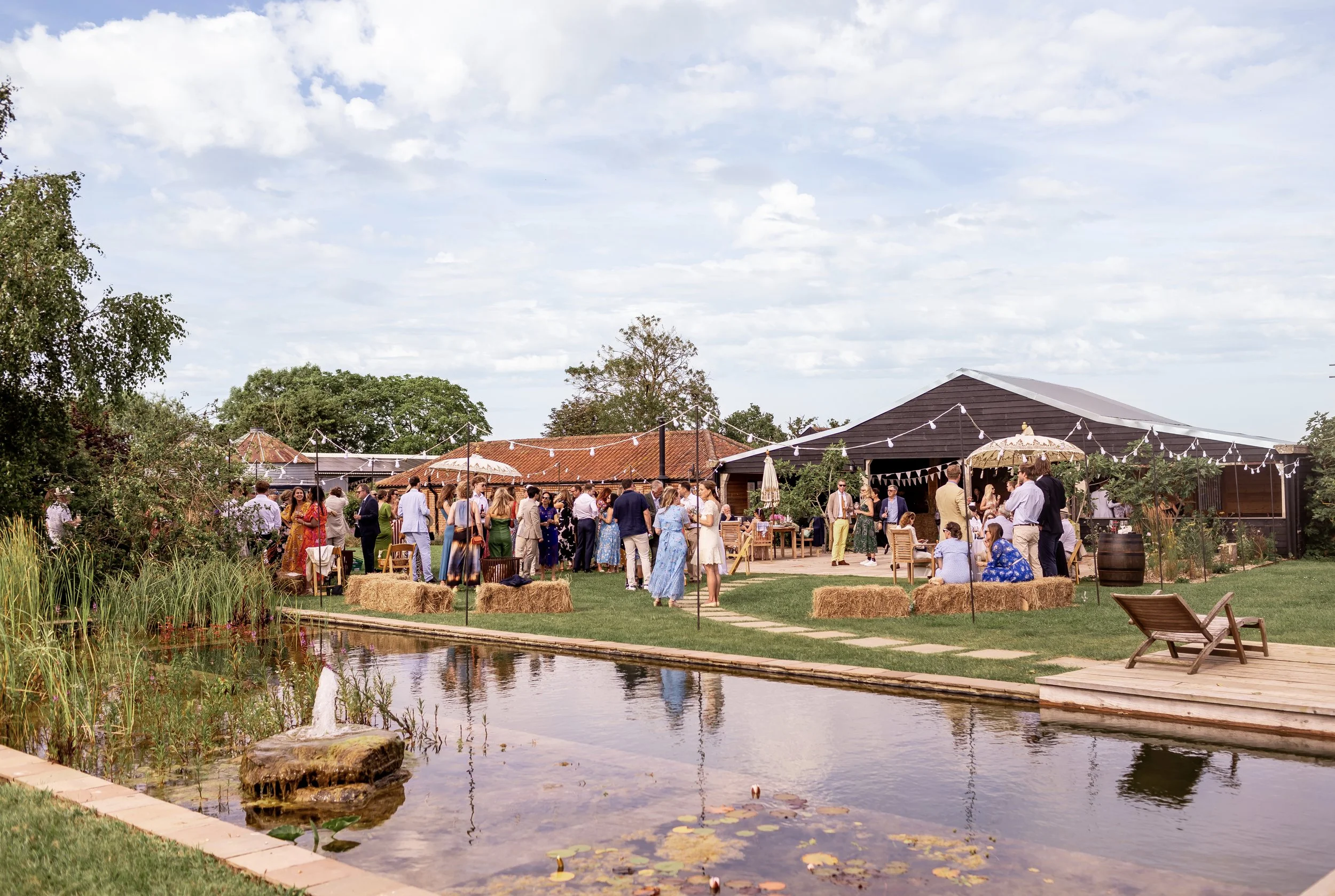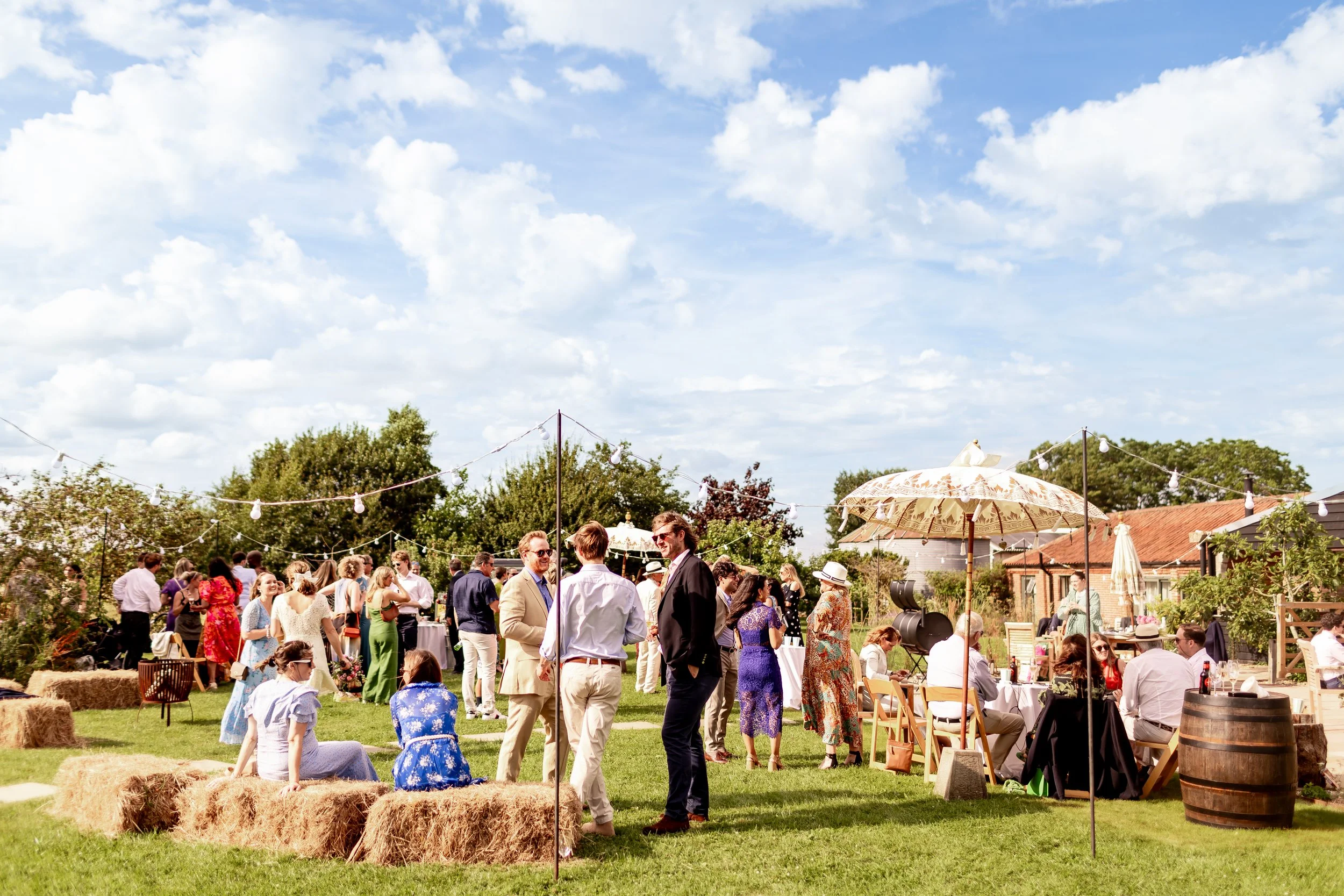 Hay bales, festoon lighting, barrel tables and fire baskets can be used to frame the garden and terrace.