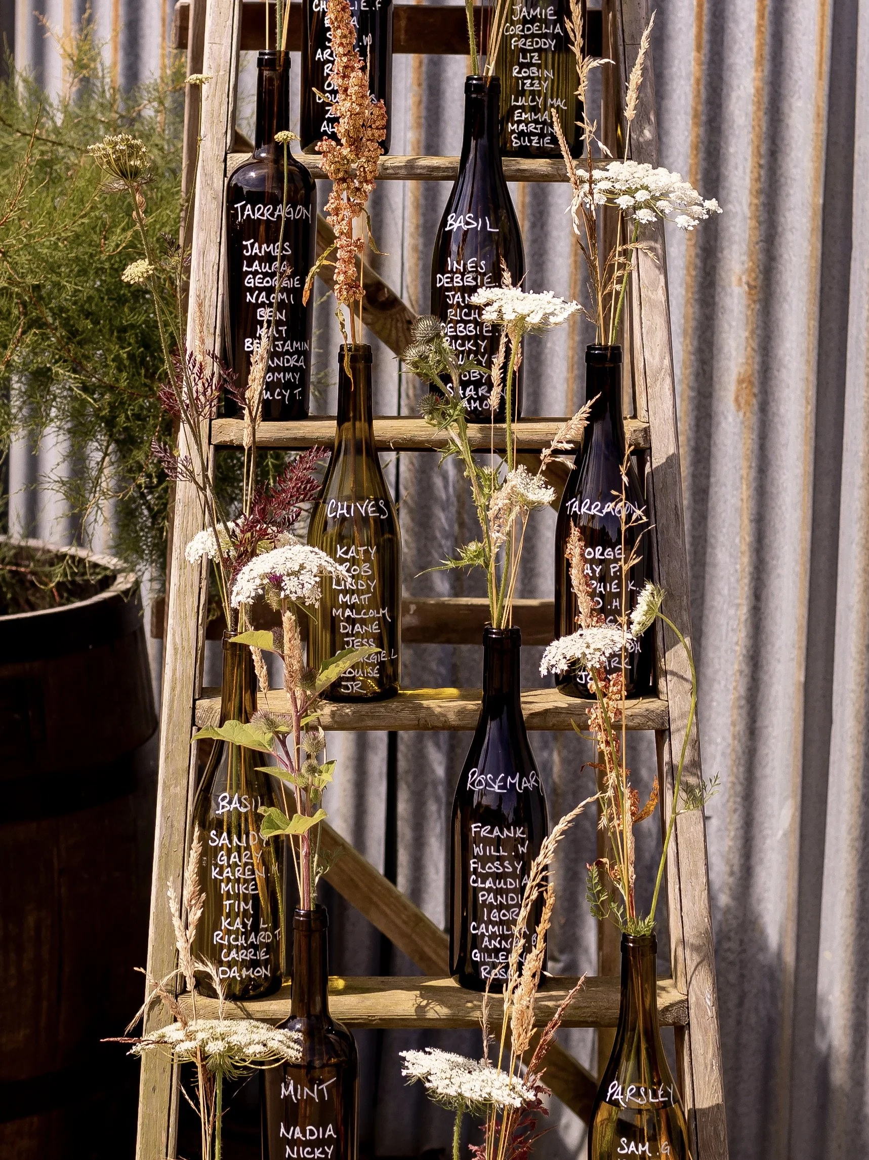 An example of a table placement presented in wine bottles on a fruit ladder with farm flowers.