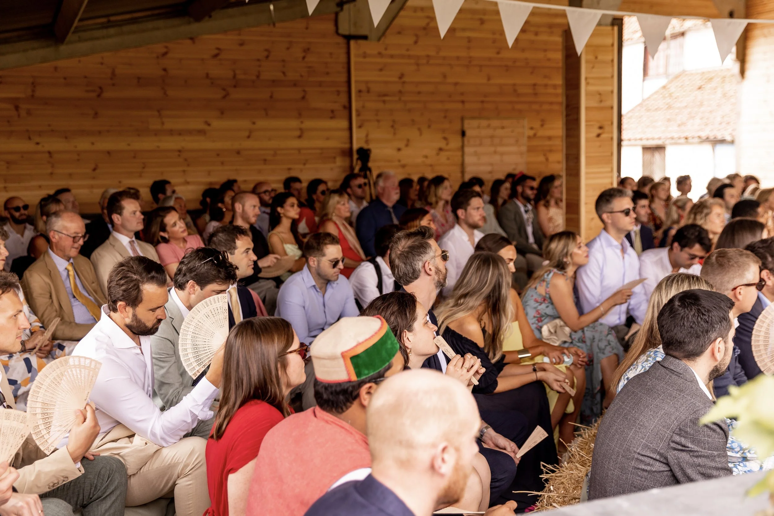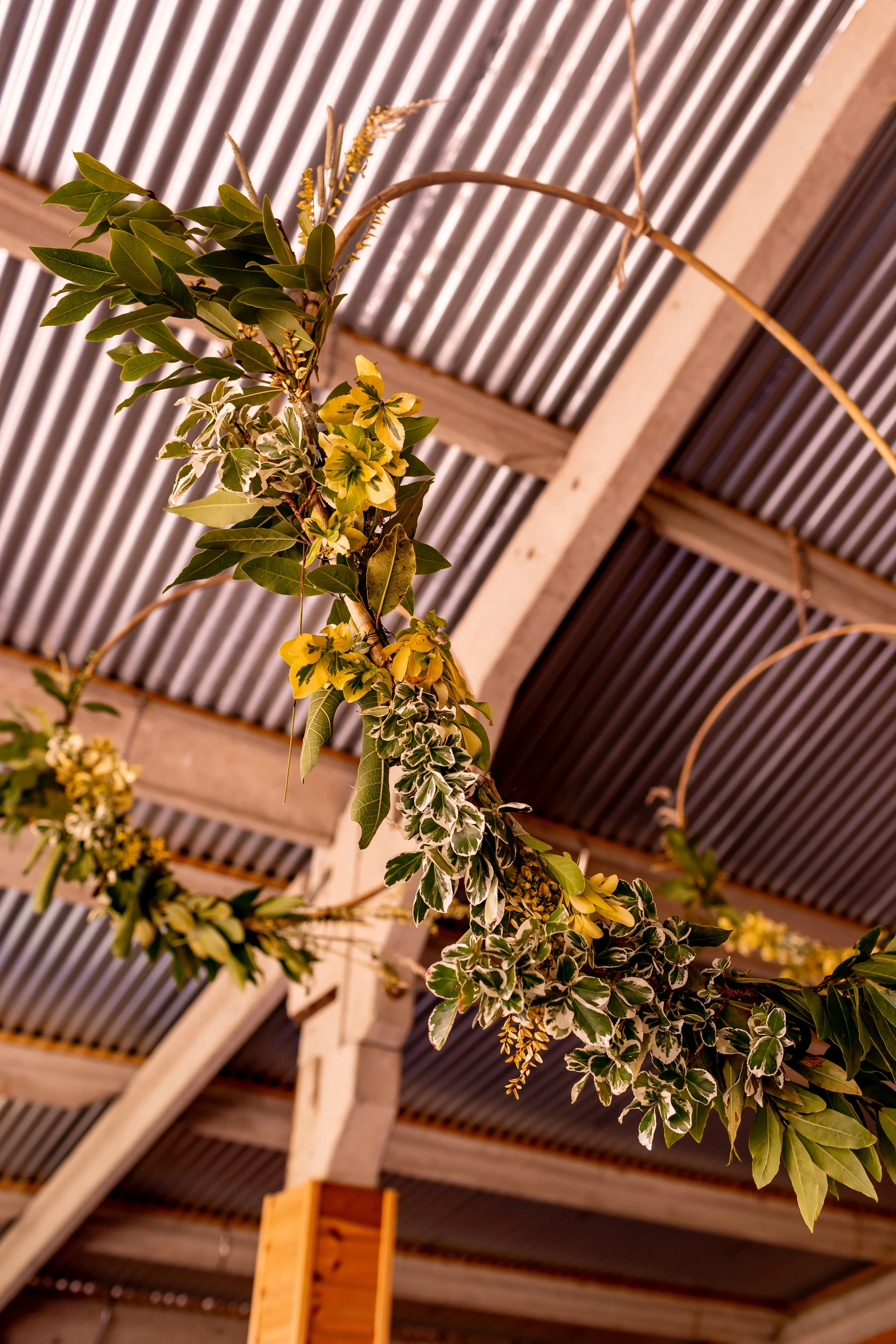 Blankets can be laid over the hay bales for guest comfort; the rafters of Sunset Barn can be decorated with bunting and botanical mobiles.